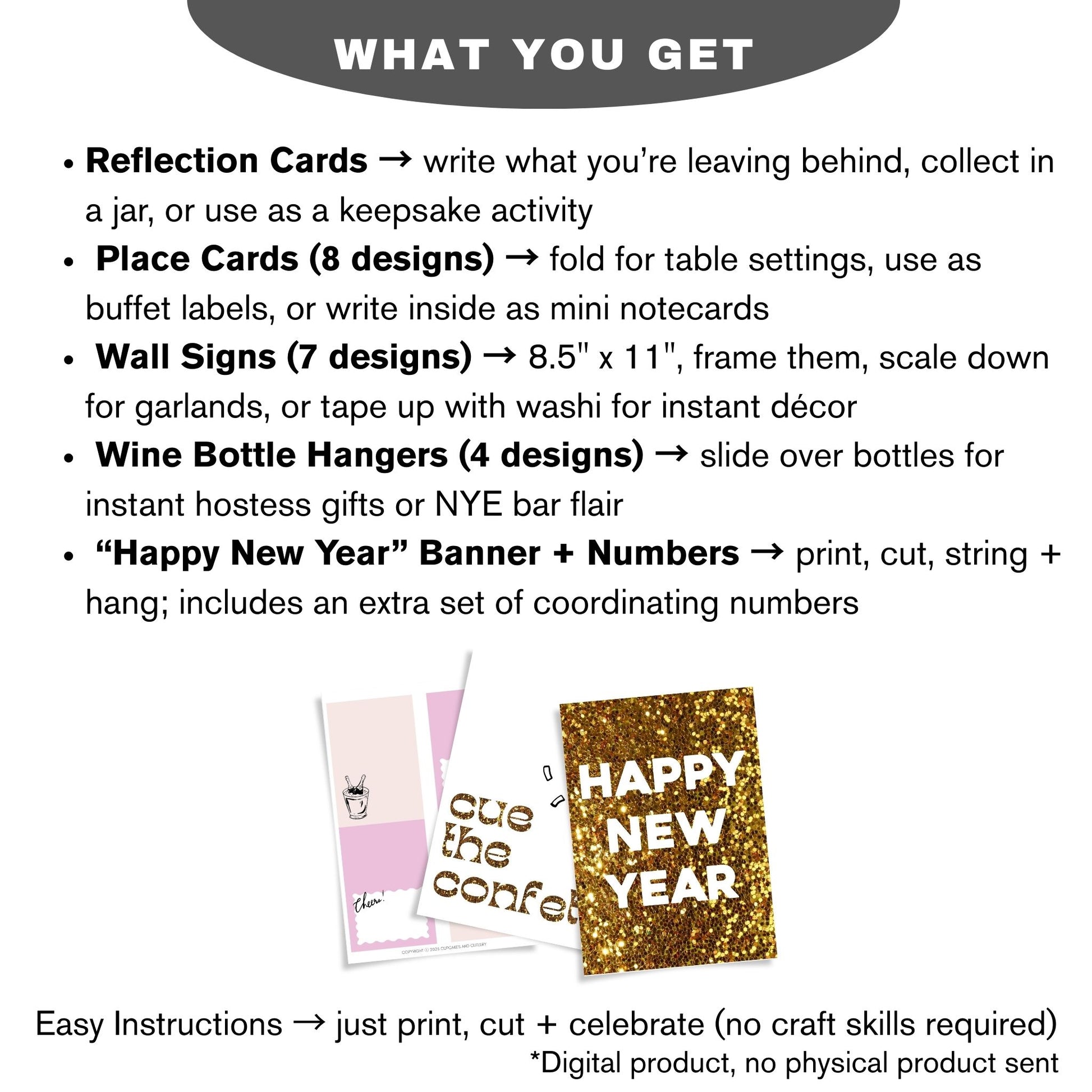 Use it to decorate a full-on bash, a cozy countdown with friends, or even just to jazz up your champagne toast at home. The flexible designs make it easy to print what you need, when you need it.
